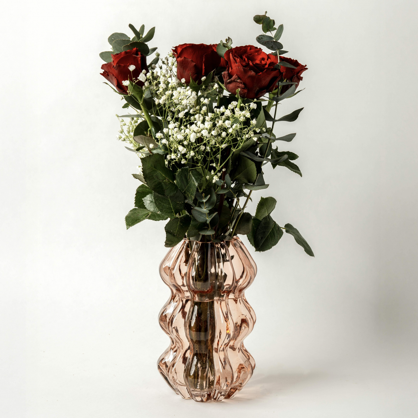Denna blomstrande hälsning innehåller röda rosor, brudslöja och eukalyptus – en perfekt kombination som uttrycker kärlek, omtanke och värme till någon du håller extra kär.
