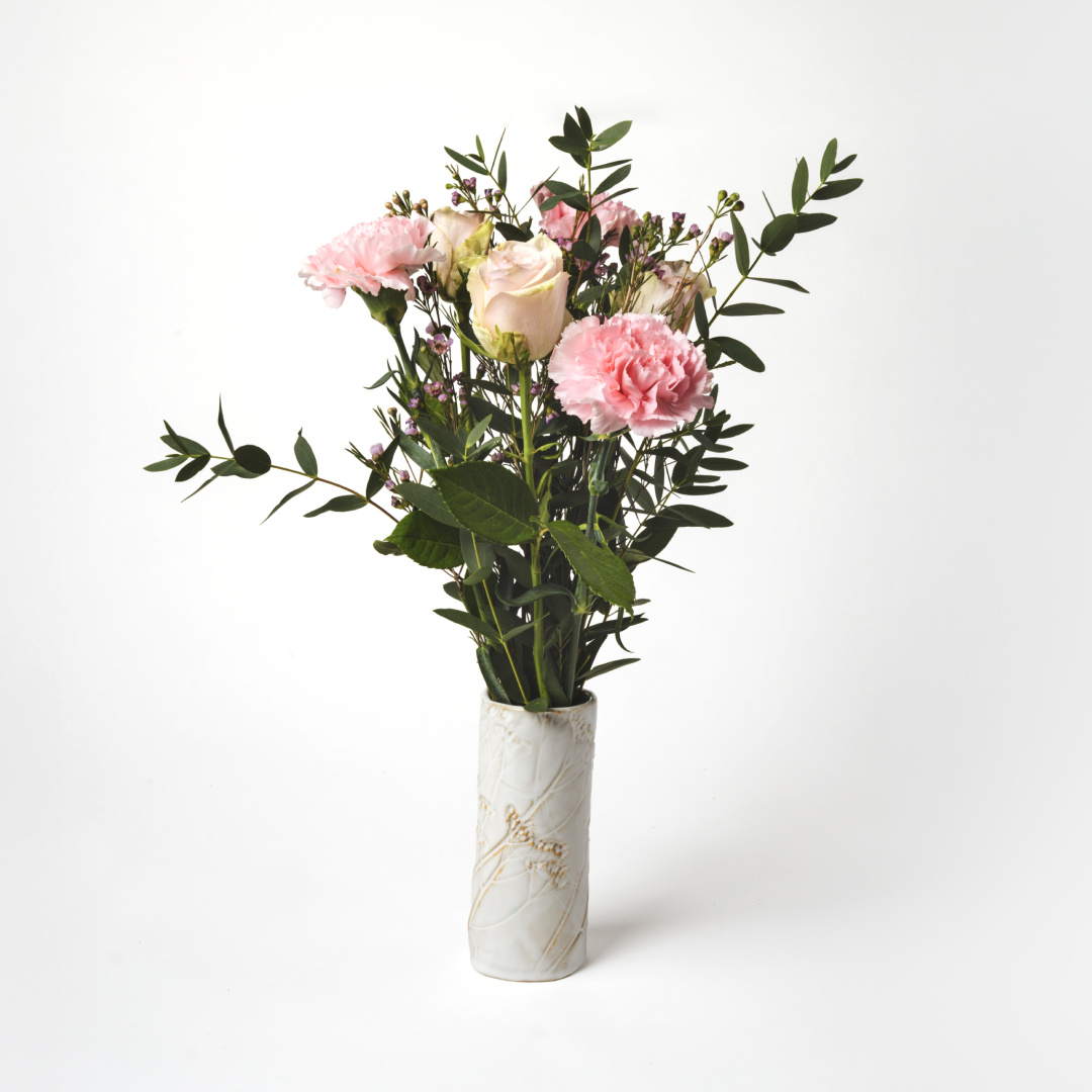 Marsbuketten är en vacker vårflirt med rosa rosor, nejlikor, vaxblommor och parvifolia.
